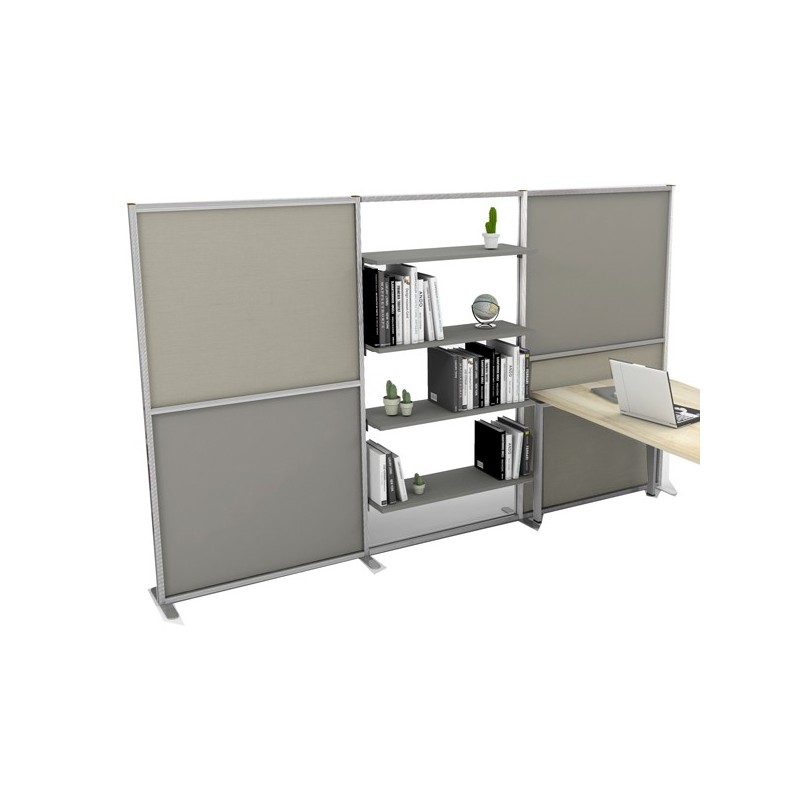 Parete divisoria autoportante con elemento ripiani, che divide gli spazi e crea più privacy. Può essere posizionato dove si desidera. Modulo centrale con n.4 ripiani in laminato finitura lino cancun. Con quattro pannelli in laminato nei colori: 2 lino cancun e 2 grigio cera. Questi colori tenui rendono la libreria adatta anche per ambienti casalinghi, studi medici, cliniche e uffici. Facile da posizionare e da pulire. Dimensioni: L307cm x H 180,5cm. Parete premontata, solo base e piani da fissare.