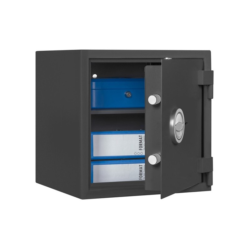 ARMADI DI SICUREZZA - Certificati EN 14450 Grado S1. importo minimo assicurabile: Denaro Euro 2.500 – Beni e Valori Euro 5.000. Chiusura a chiave a doppia mappa con due chiavi in dotazione. Maniglia colore argento, sporgenza 12 mm. Apertura porta a 180° mediante cerniere esterne. Robusti perni di chiusura sui tre lati e perni fissi nel lato cerniere posizionate a destra. Predisposta per essere fissata al pavimento o parete, materiale di fissaggio incluso. Colore: grigio scuro (RAL 7024) Misure esterne LxPxH 405x385x405mm. Misure interne LxPxH 387x315x399mm. Peso 28Kg. Capacità: 46lt. Numero ripiani: 1.