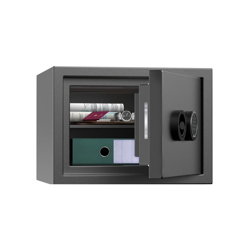 Armadi di sicurezza Certificati EN 15659 LFS30P – 30 minuti; Certificati allo scasso EN 14450 Grado S2. Importo minimo assicurabile: Denaro Euro 5.000 – Beni e Valori Euro 9.000. Serratura elettronica Wittkopp Primor, certificata VdS Classe 2. Apertura della porta a 90° tramite cerniere interne. Porta a tripla parete e corpo a doppia parete riempiti con materiale ad alta resistenza allo scasso. Meccanismi interni protetti con piastra di acciaio al manganese anti-trapano. Standard con cerniere a destra. Apertura porta a 180°. Piastre di chiusura indipendenti sui tre lati di apertura. Ripiani interni regolabili in altezza. Colore grigio scuro. Predisposta per il fissaggio al pavimento ed al muro. Materiale di fissaggio incluso. Misure esterne LxPxH: 523x475x378mm. Sporgenza della maniglia da aggiungere in profondità 32 mm. Misure interne: LxPxH: 403x310x255mm. Peso: 74kg Capacità; 32lt. Nr ripiani: 1. Serratura elettronica.
