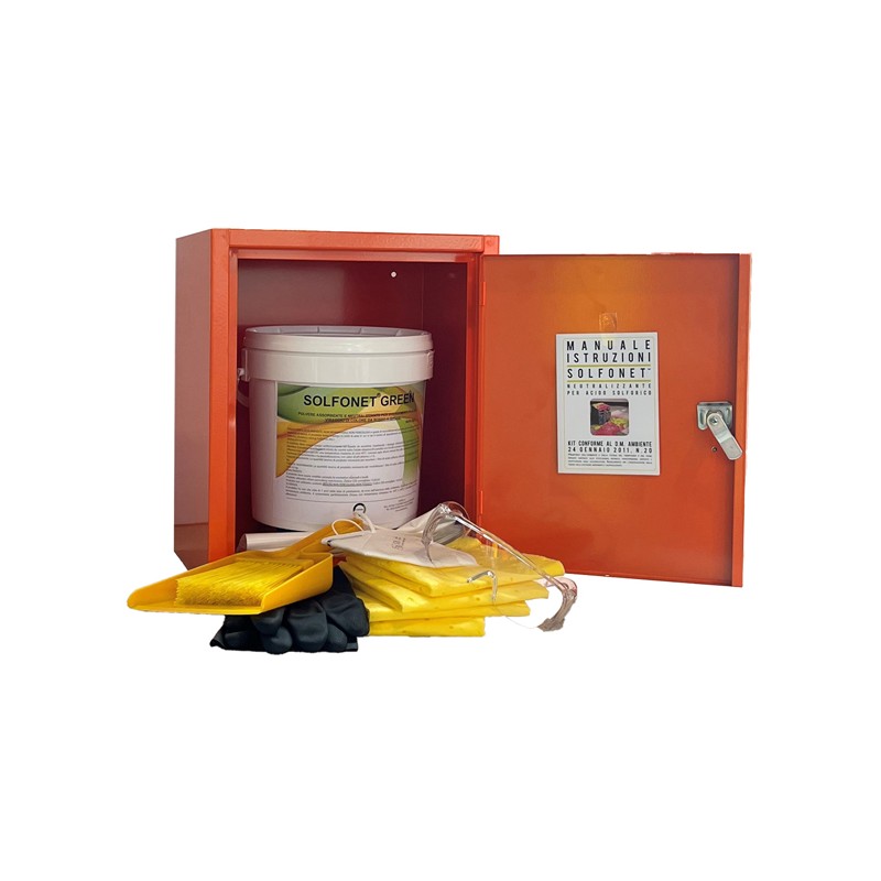 Kit composto da dispositivi DPI e materiali per la neutralizzazione, l’assorbimento e smaltimento in caso di improvvisa fuoriuscita di acido solforico dagli accumulatori (batterie) causata dalla rottura della struttura e/o di sversamenti accidentali, evitando danni alle persone e impedendo che venga assorbito dal suolo. Il kit è contenuto in armadio monoblocco metallico monoanta pre-trattato con fosfosgrassaggio in tunnel alte temperature, verniciato con polvere epossipoliestere colore arancio RAL2004 e cottura in galleria termica 180°.Con dispositivo anti-intrusione lucchettabile in zama nichelata. Dimensioni armadietto: 320x250x380mm. Contenuto armadietto: kg.5 polvere assorbente Solfonet Green DUS351G - Capacità neutralizzante assorbente: 10 lt di soluzione acida (concentraz. 1,27%) n.4 panni assorbenti per liquidi chimici dim.41x46 cm n.1 paio di guanti antiacido n.1 kit scopino e paletta n.4 sacchi smaltimento rifiuto n.1 paio occhiali di protezione n.1 mascherina di protezione n.1 manuale istruzioni SOLFONET GREEN polvere è conforme al D.L. 152/06 ed al D.lgs. n. 20 del 24/01/2011