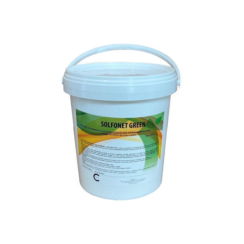 Polvere specifica per la neutralizzazione e l’assorbimento in caso di improvvisa fuoriuscita di acido solforico dagli accumulatori (batterie) causata dalla rottura della struttura e/o di sversamenti accidentali, evitando danni alle persone e impedendo che venga assorbito dal suolo. Assorbe inglobando totalmente l’acido solforico delle batterie sversato senza mai più rilasciarlo. La superficie rimane pulita, asciutta e calpestabile grazie al contenuto di una miscela di polveri speciali che provocano una reazione esotermica (calore di neutralizzazione) che dura circa 3-4 minuti neutralizzando l’acido solforico assorbito certificandolo con il viraggio colore (da bianco a rosso a giallo). La quantità teorica di prodotto necessaria per assorbire 1 litro di acido solforico (densità 1,27 kg/dm3) è di circa 0,5 kg. SOLFONET GREEN è conforme al D.L. 152/06 ed al D.lgs. n. 20 del 24/01/2011