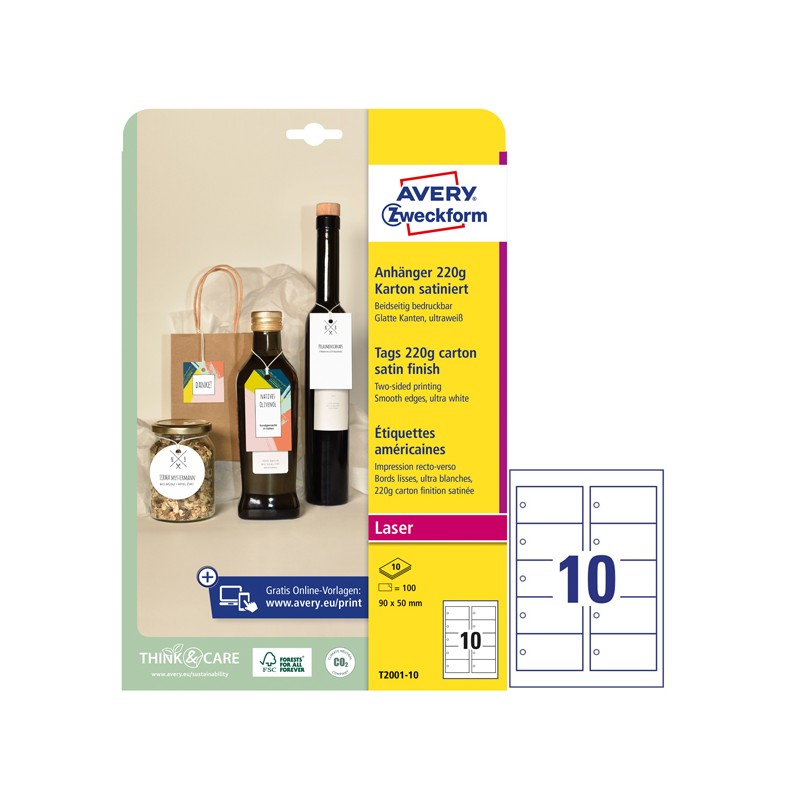 Robusto cartoncino da 220gr con finitura satina. Bordi perfettamente lisci grazie alla tecnologia Quick&Clean™. Stampabili su due lati (per stampanti laser). Cordoncini per applicazione inclusi. Applicazione: etichette per i prodotti (alimentari, bevande, biologici, artigianato, ecc.); Etichette per l’abbigliamento; confezioni regalo. Per la personalizzazione è possibile utilizzare il programma di progettazione e stampa gratuito «Crea e Stampa online» di Avery con modelli di disegni già impostati da modificare e personalizzare con i propri testi e immagini.