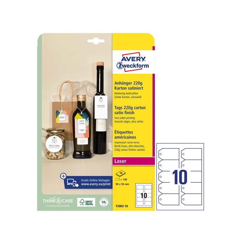 Robusto cartoncino da 220gr con finitura satina. Con angoli tagliati. Bordi perfettamente lisci grazie alla tecnologia Quick&Clean™. Stampabili su due lati (per stampanti laser). Cordoncini per applicazione inclusi. Applicazione: etichette per i prodotti (alimentari, bevande, biologici, artigianato, ecc.); Etichette per l’abbigliamento; confezioni regalo. Per la personalizzazione è possibile utilizzare il programma di progettazione e stampa gratuito «Crea e Stampa online» di Avery con modelli di disegni già impostati da modificare e personalizzare con i propri testi e immagini.