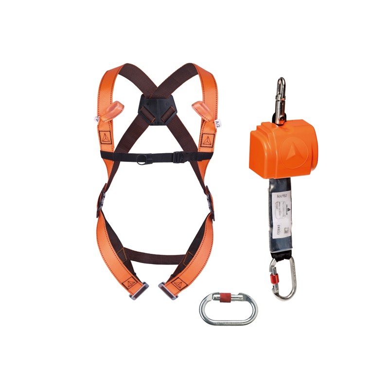 Kit anticaduta con imbracatura con cinghie bicolori e anticaduta a richiamo automatico a cinghia per spostamenti brevi. Con borsa di stoccaggio. Punto di ancoraggio anticaduta : 2 (dorsale/sternale). Situazioni di arresto di caduta: piccolo spostamento verticale o su piano inclinato (meno di 3m).