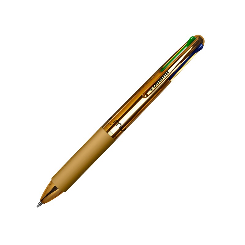 Penna a sfera con 4 colori di inchiostro (blu, rosso, verde e nero). Inchiostro ultra-fluido e super scorrevole, punta 1.0mm. Dotata di pratica clip.