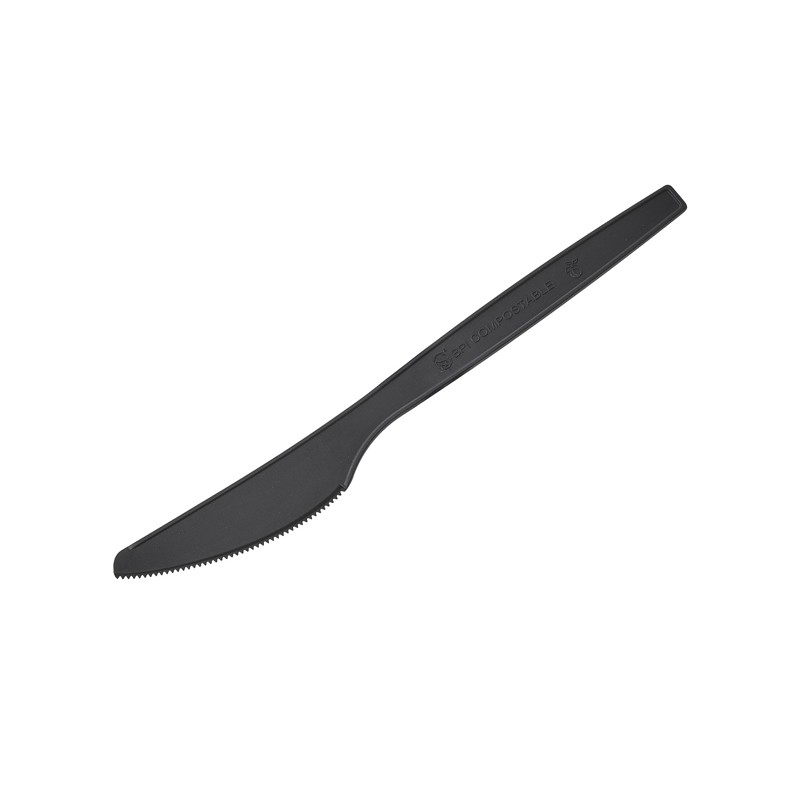 Coltello realizzato in CPLA , ovvero PLA Cristallizzato, polimero derivato del mais resistente fino a 85°C. Biodegradabile e compostabile secondo norma EN13432. • Dimensioni : 16 cm • Peso unitario: 3.6 gr • Colore: nero