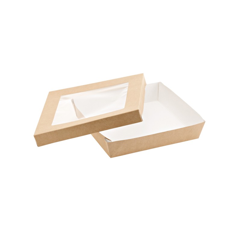 Scatola in carta KRAFT/PE avana con finestra trasparente 18x18x5cm, 1500ml. Peso netto unità 36gr. Idoneo al contatto con alimenti caldi(70°C per 2 ore), freddi e solidi. Il prodotto non può essere utilizzato unitamente all'alimento nel forno tradizionale e forno a microonde.Conservare in luogo asciutto e lontano da fonti di calore e raggi del sole(0°C+35°C). Articolo monouso.