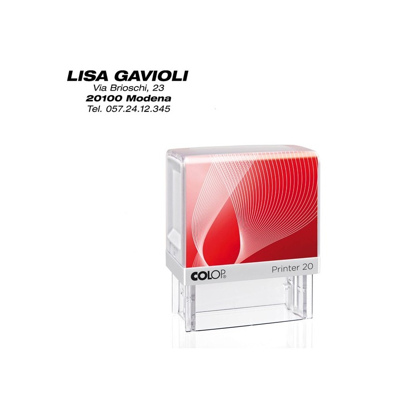 Timbro Printer 20 G7 autoinchiostante. Compatto con nuova montatura in ABS antiurto. Ampio spazio per individuazione del timbro. Dotato di tampone inchiostrato di colore nero. Personalizzabile su 4 righe con logo, indirizzo o altro testo. Area stampa 14x38 mm. Tampone di ricambio E/20.