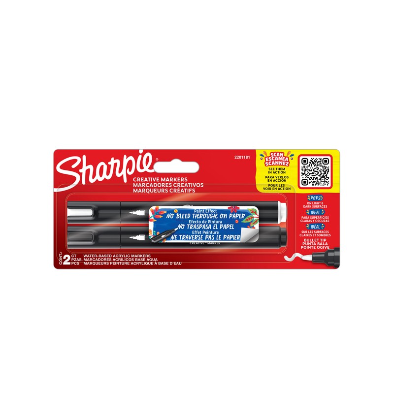 Marcatore creativo a punta tonda, inchiostro a base acqua in 2 colori vivaci che non sbiadiscono. Scrive su diverse superfici, sia chiare che scure.