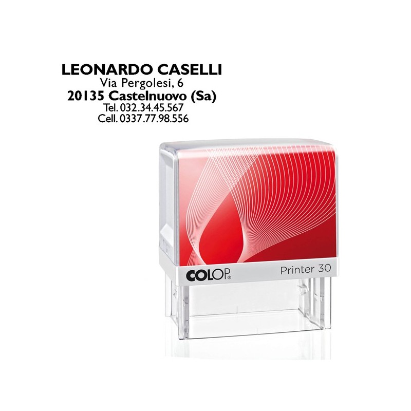 Timbro Printer 30 G7 autoinchiostante. Compatto con nuova montatura in ABS antiurto. Ampio spazio per individuazione del timbro. Dotato di tampone inchiostrato di colore nero. Personalizzabile su 5 righe con logo, indirizzo o altro testo. Area stampa 18x47mm. Tampone di ricambio E/30.