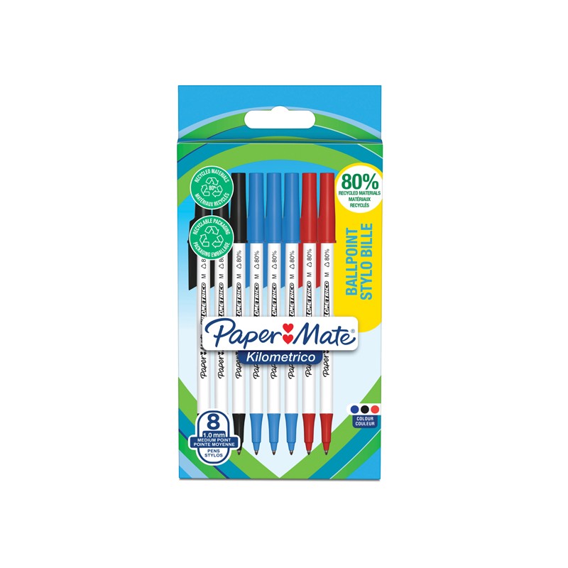 Penna a sfera con cappuccio. Fusto arrotondato per una presa comoda. Lunghezza di scrittura 1 chilometro. Realizzata con l'80% di plastica riciclata. Astuccio da 8 penne in 3 colori assortiti (nero,blu,rosso).