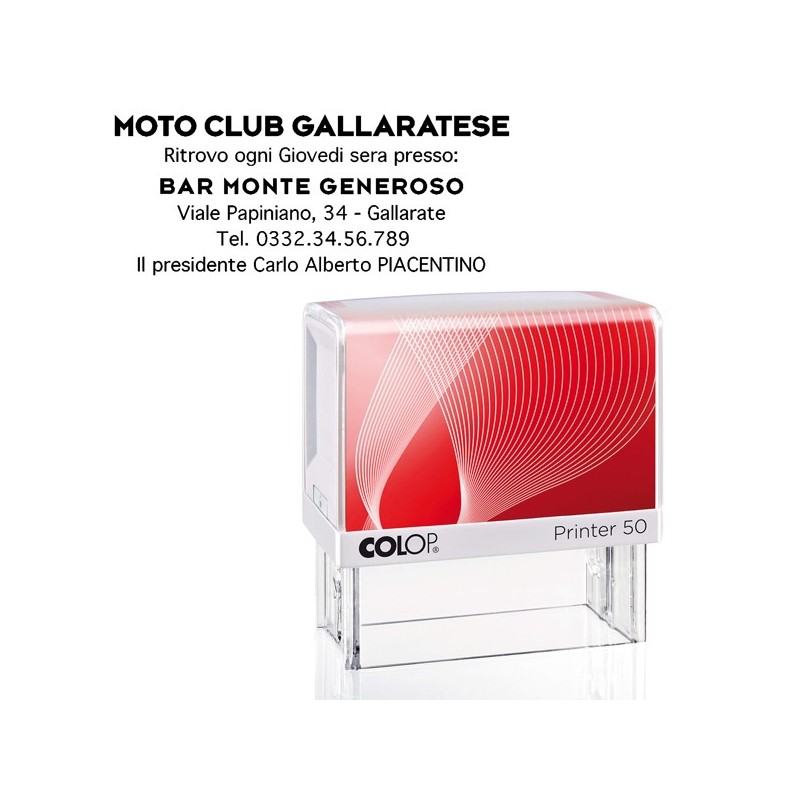 Timbro Printer 50 G7 autoinchiostante. Compatto con nuova montatura in ABS antiurto. Ampio spazio per individuazione del timbro. Dotato di tampone inchiostrato di colore nero. Personalizzabile su 7 righe con logo, indirizzo o altro testo. Area stampa 30x69mm. Tampone di ricambio E/50.