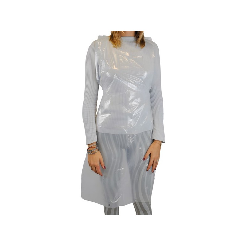 Grembiule in LDPE, 30 my. Dimensioni 70x120 cm. DPI I categoria. Taglia unica. Ideale per settore agroalimentare e ittico. Allacciatura posteriore con fettucce.