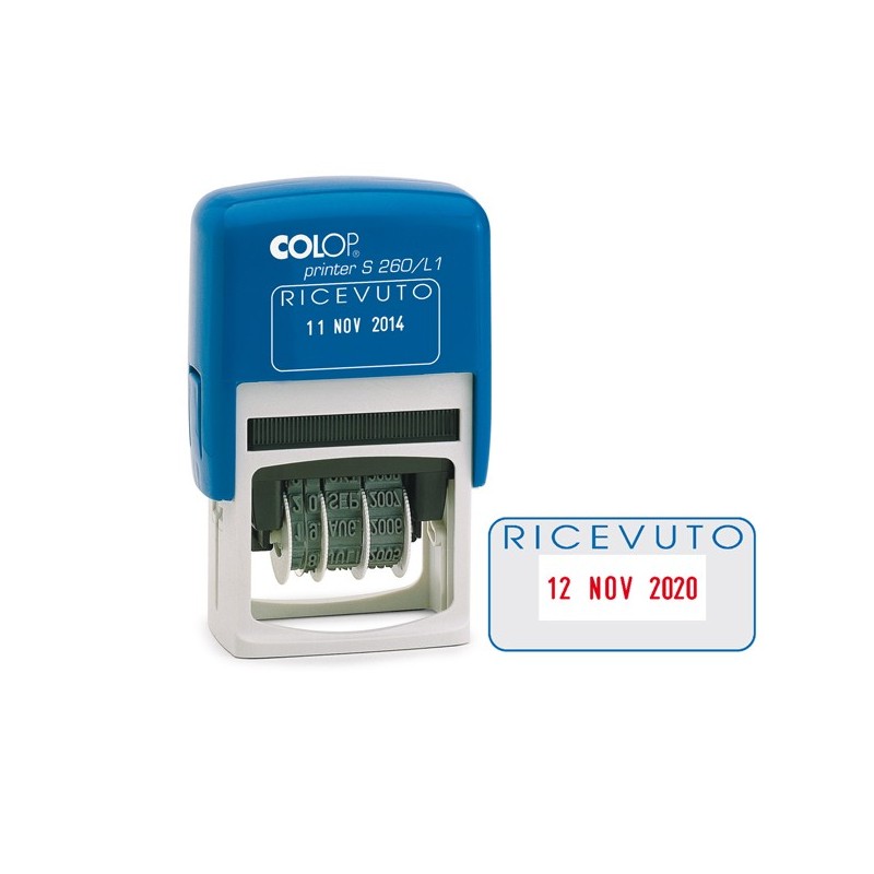 Timbro datario con dicitura fissa RICEVUTO. Fusto antiurto in ABS. Caratteri con altezza da 4mm. Tampone preinchiostrato bicolore blu/rosso (cod.48015). Tampone ricambio nero E/200 (cod. 91971).
