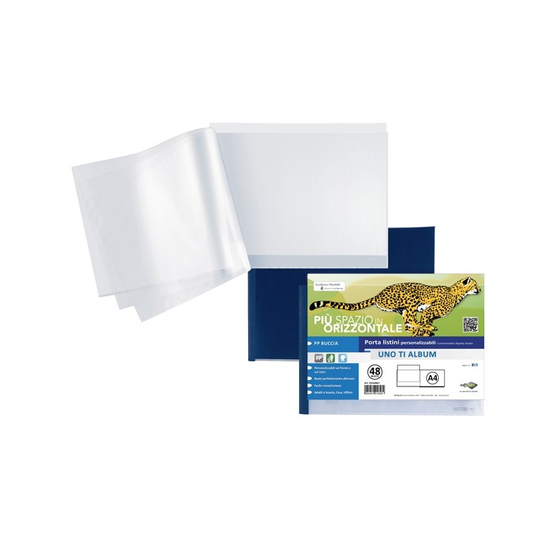 Album porta listini personalizzabile da 48 buste in PP buccia, con copertina e retro personalizzabili. Dorso blu. Il perfetto allineamento delle buste e la particolare saldatura facilitano la consultazione. Ideali per statistiche, manuali, disegni, fotografie, progetti.