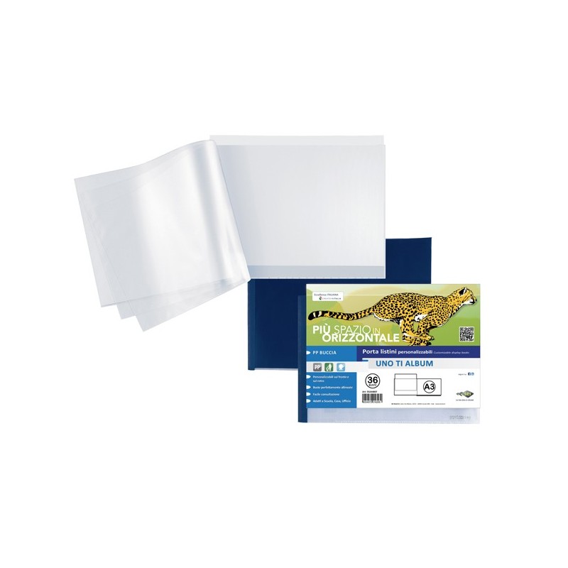 Album porta listini personalizzabile a 36 buste in PP buccia, con copertina e retro personalizzabili. Il perfetto allineamento delle buste e la particolare saldatura facilitano la consultazione. Ideali per statistiche, manuali, disegni, fotografie, progetti. Formato contenuto 420x300mm (A3 album).