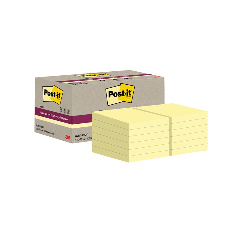 Foglietti Post-it®SuperSticky Green in carta riciclata al 100%. Doppia forza adesiva rispetto al trazizionale. Confezione in carta riciclata. Blocchetti da 70 fogli giallo Canary.