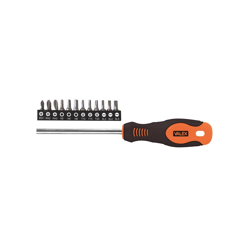 Cacciavite portainserto magnetico con attacco da 1/4''. Inserti in acciaio CRV. Contiene nr.3 perviti con intaglio, nr.3 phillips, nr.3 torx e nr.3 esagonale.