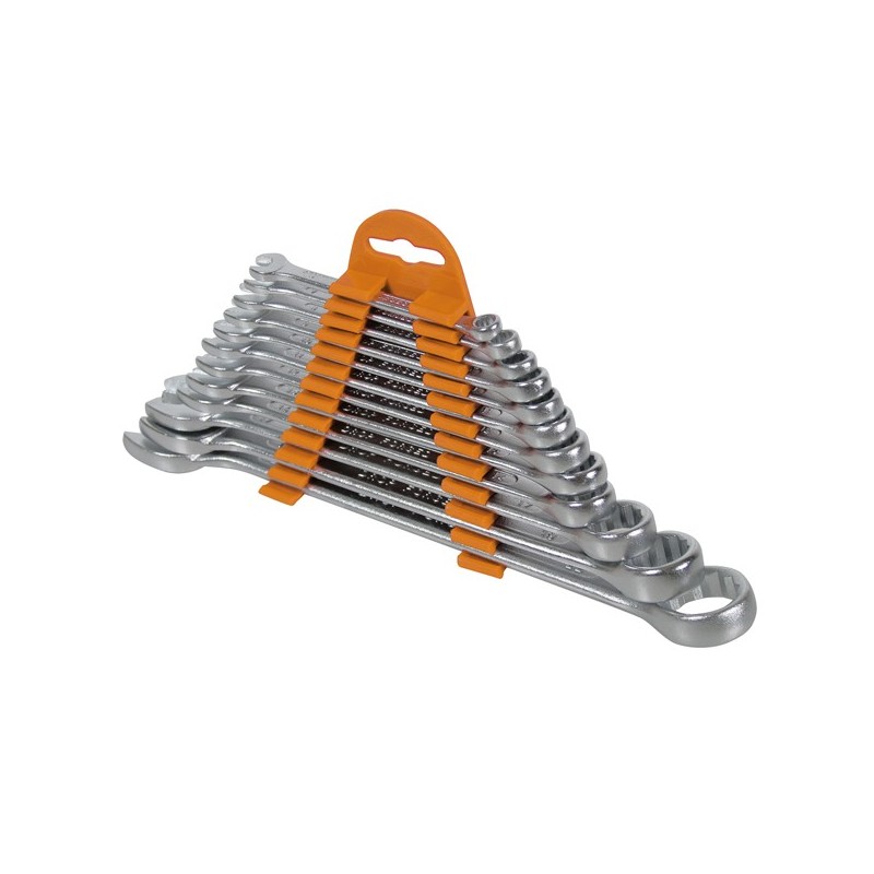 Chiavi con misure: 6-7-8-9-10-11-12-13-14-17-19-22mm. Teste inclinate di 15°. Corpo inacciaio cromo vanadio. Finitura lucida. Supporto in plastica.