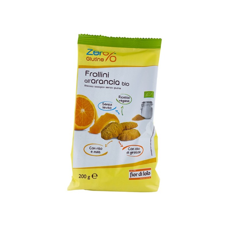 Frollini biologici all'arancia senza glutine. Prodotto da forno senza glutine specificamente formulato per celiaci. Confezione 200gr.