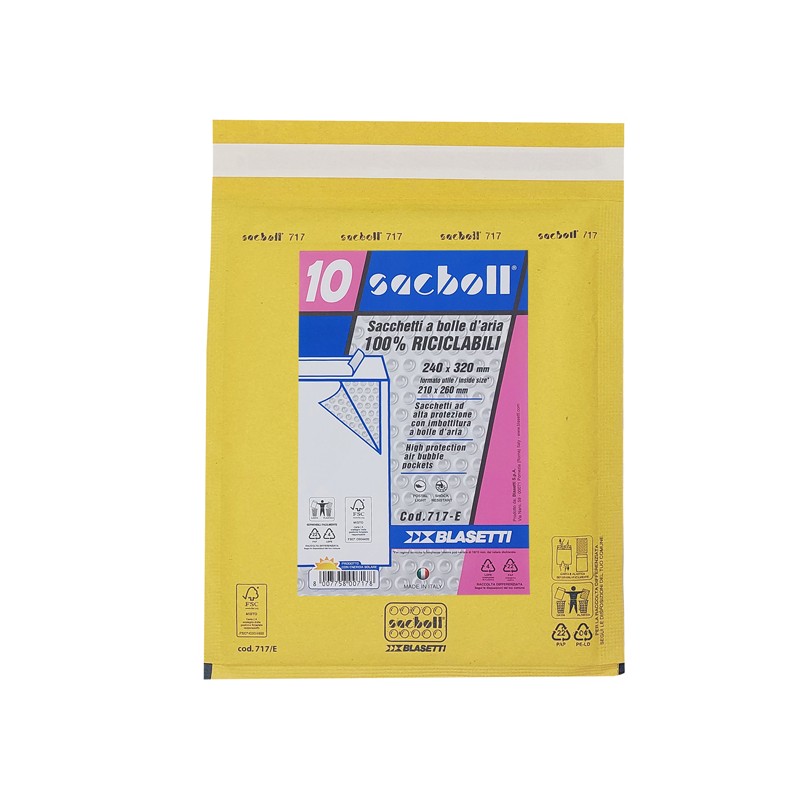 Sacco in carta avana certificata FSC imbottito con pluriboll. Polietilene a bolle. Termosaldato su tre lati.Lembo autoadesivo protetto da Strip Dati tecnici: Modello: E Formato: 24X32cm Formato interno : 21X26cm Cartone certificato FSC