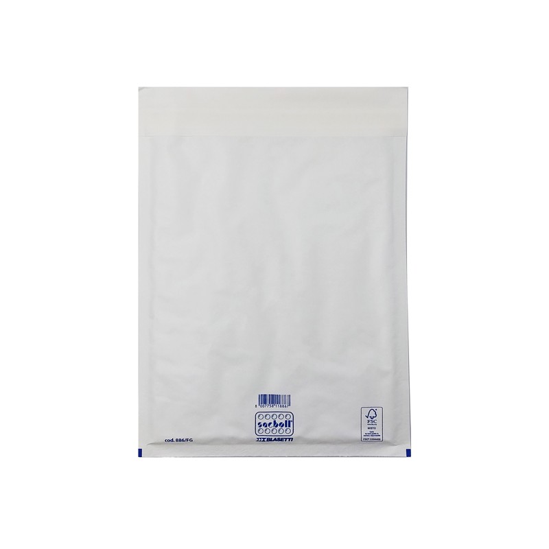 Sacco in carta bianca certificata FSC imbottito con pluriboll. Polietilene a bolle. Termosaldato su tre lati.Lembo autoadesivo protetto da Strip Dati tecnici: Modello: GF Formato: 25X39cm Formato interno : 22X33cm Cartone certificato FSC