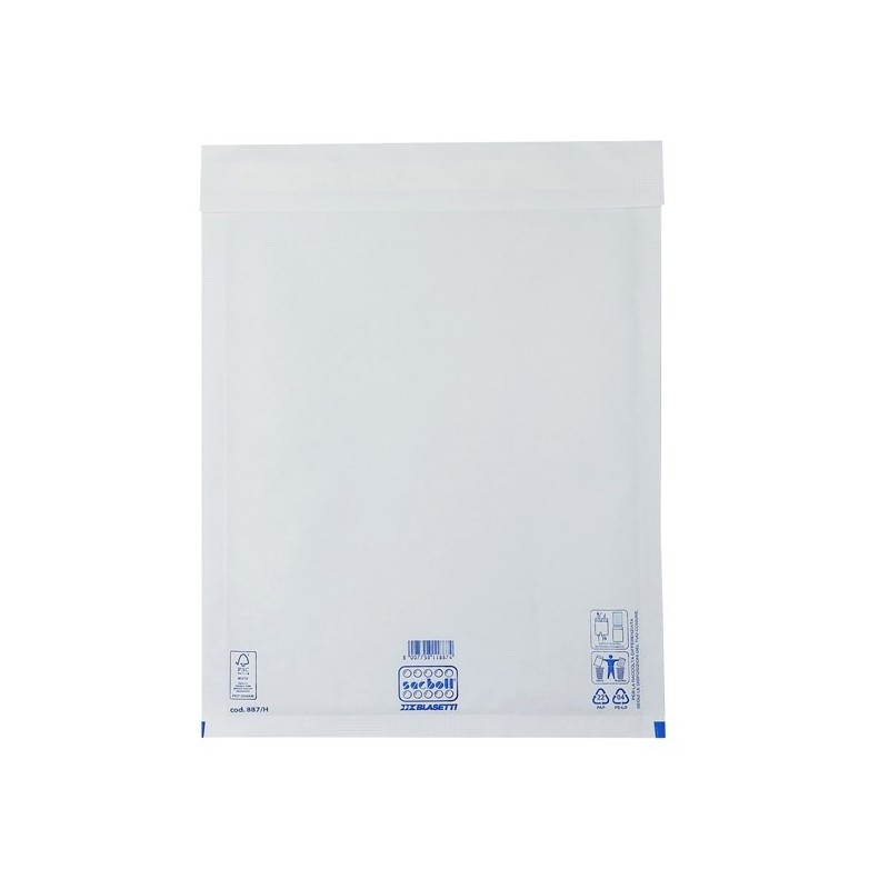 Sacco in carta bianca certificata FSC imbottito con pluriboll. Polietilene a bolle. Termosaldato su tre lati.Lembo autoadesivo protetto da Strip Dati tecnici: Modello: H Formato: 29X42cm Formato interno : 26X36cm Cartone certificato FSC