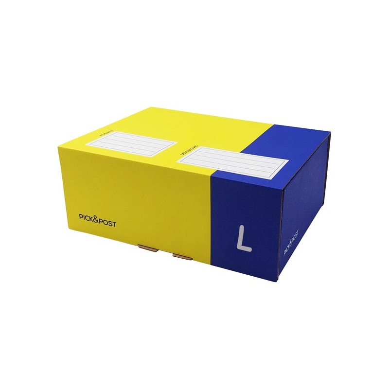 Scatole automontanti per e-commerce in cartone microonda stampato giallo e blu Cartone certificato FSC. Stampa spazio di scrittura MITTENTE/DESTINATARIO. Istruzioni di montaggio stampate all'interno della scatola.