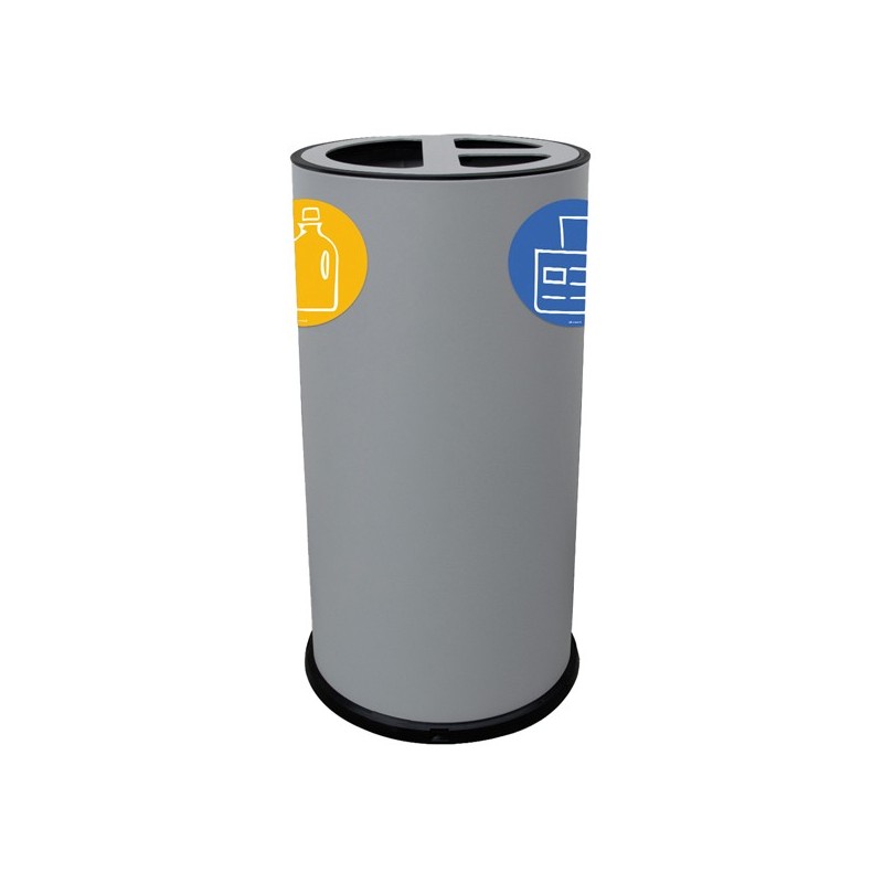 Contenitore tondo 3 scomparti con 4 pittogrammi per raccolta differenziata magnetici in acciaio verniciato. Dimensioni: Ø35xH72cm.