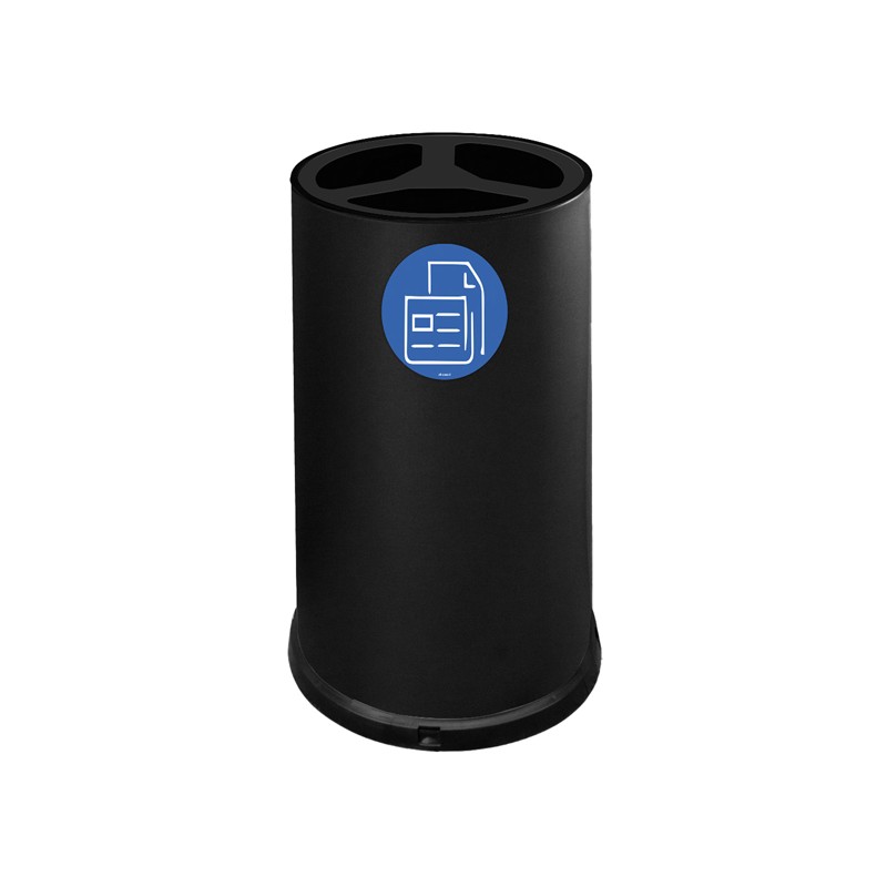 Contenitore tondo 3 scomparti con 4 pittogrammi per raccolta differenziata magnetici in acciaio verniciato. Dimensioni: Ø45xH72cm.