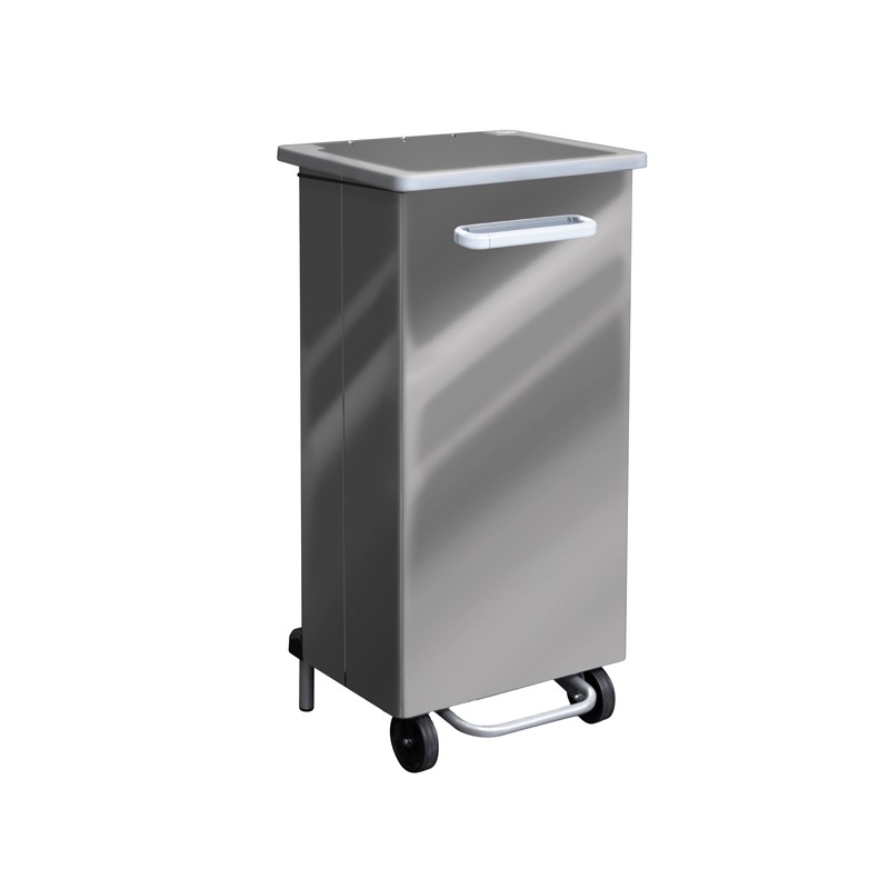 Contenitore a pedale per raccolta rifiuti totalmente in acciaio con svuotamento frontale. Fornito montato. Dimensione: 47x37xH96cm - 110L. Haccp.