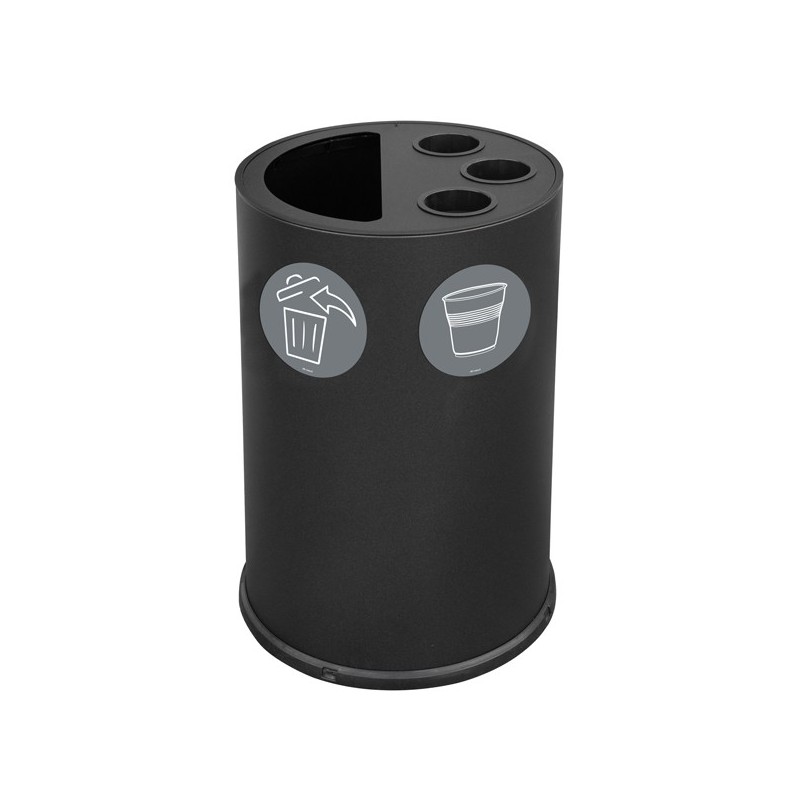 Contenitore per raccolta bicchieri,palette e rifiuti da interno, cover a tre fori con tubi rigidi Ø int 92 mm per impilaggio bicchieri da 200 a 500 cc e uno scomparto (50Lt) per raccolta rifiuti separatamente dai bicchieri. Pratico tondino reggisacco ad incastro in acciaio zincato e svuotamento dall'alto. Il fusto con il relativo fondo e la cover forata sono realizzati in acciaio e rifiniti con verniciatura termoindurente. L'anello superiore, i tubi e il bordo salva-pavimento sono realizzati in materiale plastico. 2 pittogrammi magnetici inclusi. Dimensioni: Ø 45xh. 72cm.