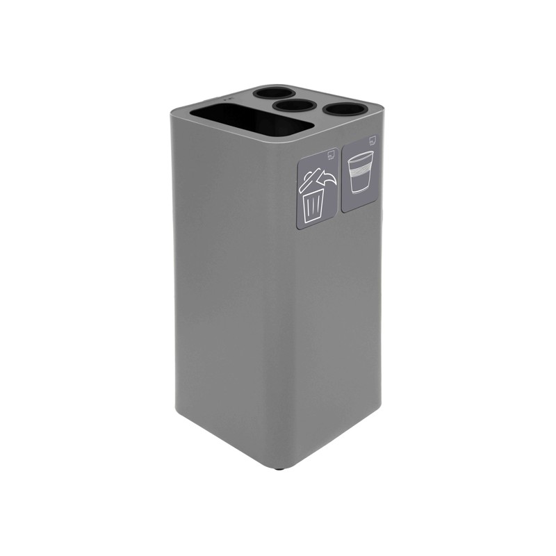 Contenitori da 100Lt per raccolta bicchieri, palette e rifiuti da interno, cover a tre fori con tubi rigidi Ø int. 92mm per impilaggio bicchieri da 200 a 500 cc e uno scomparto (50Lt.) per raccogliere i rifiuti separamente dai bicchieri. Pratico tondino reggisacco ad incastro in acciaio zincato e svuotamento dall'alto. Il fusto con il relativo fondo e la cover forata sono realizzati in acciaio e rifiniti con verniciatura termoindurente; i tubi e i piedini sono realizzati in materiale plastico.