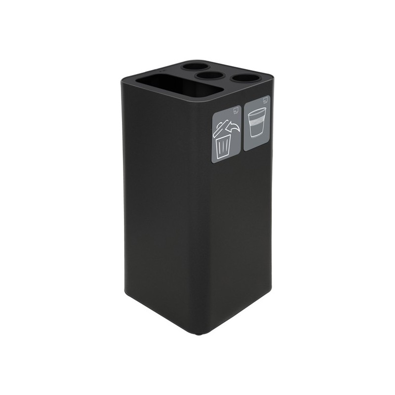 Contenitori da 100Lt per raccolta bicchieri, palette e rifiuti da interno, cover a tre fori con tubi rigidi Ø int. 92mm per impilaggio bicchieri da 200 a 500 cc e uno scomparto (50Lt.) per raccogliere i rifiuti separamente dai bicchieri. Pratico tondino reggisacco ad incastro in acciaio zincato e svuotamento dall'alto. Il fusto con il relativo fondo e la cover forata sono realizzati in acciaio e rifiniti con verniciatura termoindurente; i tubi e i piedini sono realizzati in materiale plastico. 2 pittogrammi magnetici inclusi. Dimensioni: 38x38x80cm.
