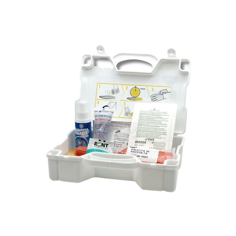 Kit di emergenza con polvere addensante per la raccolta di liquidi biologici. La polvere addensante ha un’elevata capacità assorbente. Indicato in luoghi come ospedali, studi dentistici, case di cura, ricoveri, sale prelievi e scuole. Nei laboratori, la gestione sicura dei liquidi biologici diventa efficiente ed efficace, contribuendo al rispetto delle normative e alla sicurezza del personale. Le aziende beneficiano della sua utilità in situazioni di emergenza e nell'affrontare attività quotidiane che coinvolgono sostanze liquide. La polvere a contatto con la massa liquida sia trasforma in una massa gelatinosa che può essere raccolta senza lasciare residui. Il quantitativo di polvere contenuto nel kit può assorbire fino a 4 litri di liquido. L’addensamento avviene in 3/5 minuti.