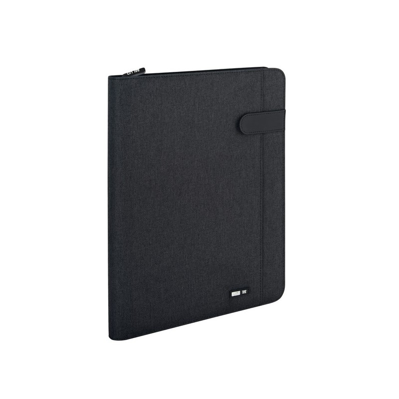 Portablocco in tessuto tecnico e chiusura in ecopelle. Formato A4 chiusura con zip, tasca esterna con chiusura a bottone, scomparti per biglietti, tasca interna portadocumenti, portapenna, completo di blocco. Dimensioni: 25x33,5cm.