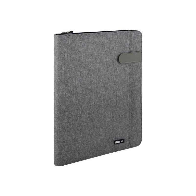 Portablocco in tessuto tecnico e chiusura in ecopelle. Formato A4 chiusura con zip, tasca esterna con chiusura a bottone, scomparti per biglietti, tasca interna portadocumenti, portapenna, completo di blocco. Dimensioni: 25x33,5cm.