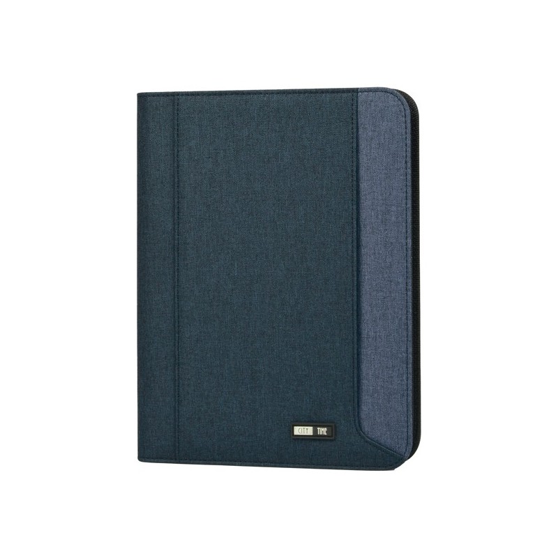 Portablocco in tessuto tecnico bicolore. Formato A4, chiusura con zip, scomparti per biglietti, tasca interna portadocumenti, portapenna, completo di blocco. Dimensioni 26x34cm.