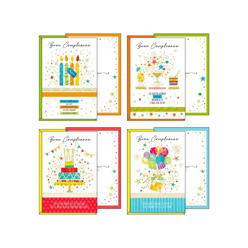 Biglietti doppi formato 11,7x17cm. Stampa offset su cartoncino liscio bianco. Blisterati 1 busta/1 biglietto. Con rifiniture dorate.