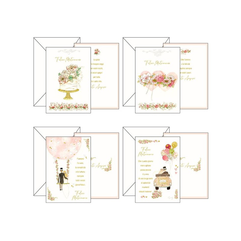 Biglietti doppi formato 11,7x17cm. Stampa offset su cartoncino liscio bianco. Blisterati 1 busta/1 biglietto. Fantasie assortite.