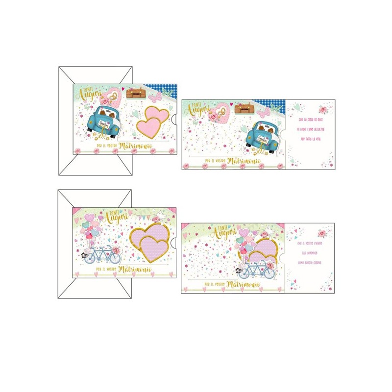 Biglietti doppi formato 11,7x17cm. Stampa offset su cartoncino liscio bianco. Blisterati 1 busta/1 biglietto. Fantasie assortite.