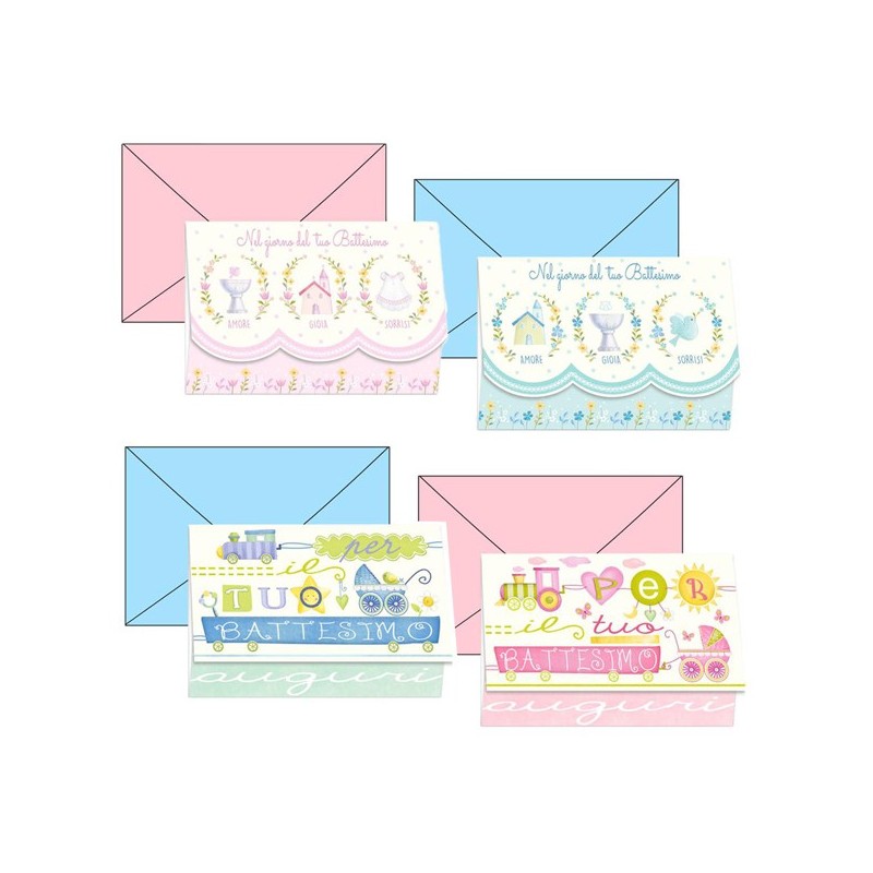 Biglietti doppi formato 11,7x17cm. Portasoldi, stampa offset su cartoncino liscio bianco. Blisterati 1 busta/1 biglietto. Fantasie assortite.