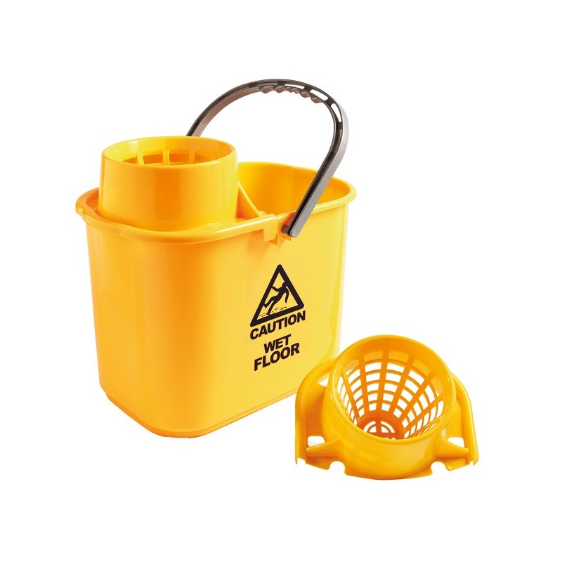 Secchio con strizzatore esterno capacità 15L. Sistema colore per prevenire la contaminazione batterica tra diversi ambienti. Dimensioni: 30x27xH37cm .