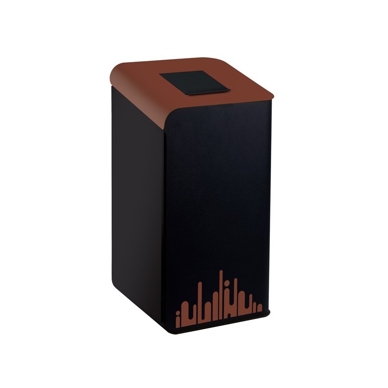 Corpo e coperchio in metallo verniciato; coperchi colorati per incentivare la raccolta differenziata; etichette “skyline” colorate già applicate; sistema reggisacco integrato; apertura mediante sportello superiore; ideale per creare isole ecologiche; in opzione, 4 piedini regolabili in altezza; kit quattro ruote Ø 40 mm (2 ruote con freno); in opzione, etichette pre-fustellate in vinile per la differenziata. Dimensioni: L40,5 x 42,5 x 79,5cm.