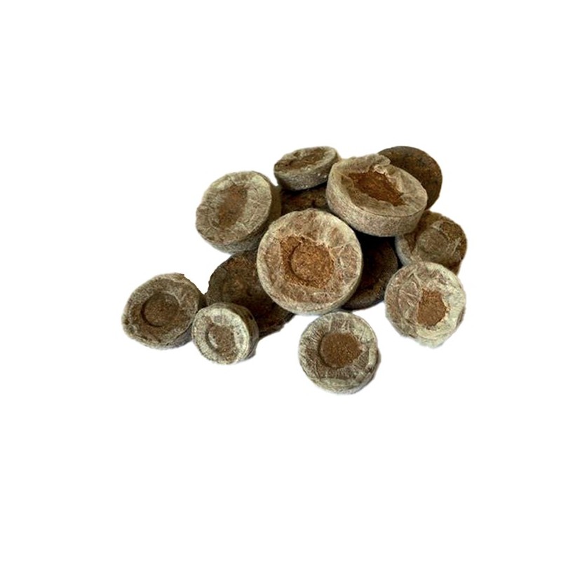 Pastiglie di torba compresse 100% biodegradabili, certificate per coltivazioni organiche.