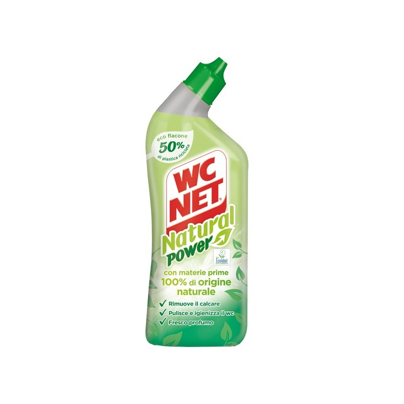 WC Net disincrostante Natural Power 700ml realizzato con materie prime 100% di origine naturale. Rimuove il calcare, igienizza e rilascia un fresco profumo. Eco flacone con 50% di plastica riciclata. Certificato Ecolabel.