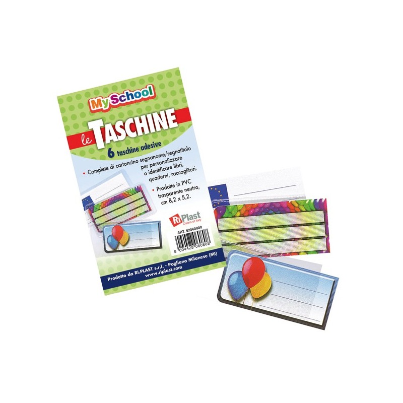 Taschine adesive complete di cartoncino segnanome per personalizzare o identificare libri, quaderni, raccoglitori. Realizzate in PVC trasparente neutro. Confezione da 6 pz.