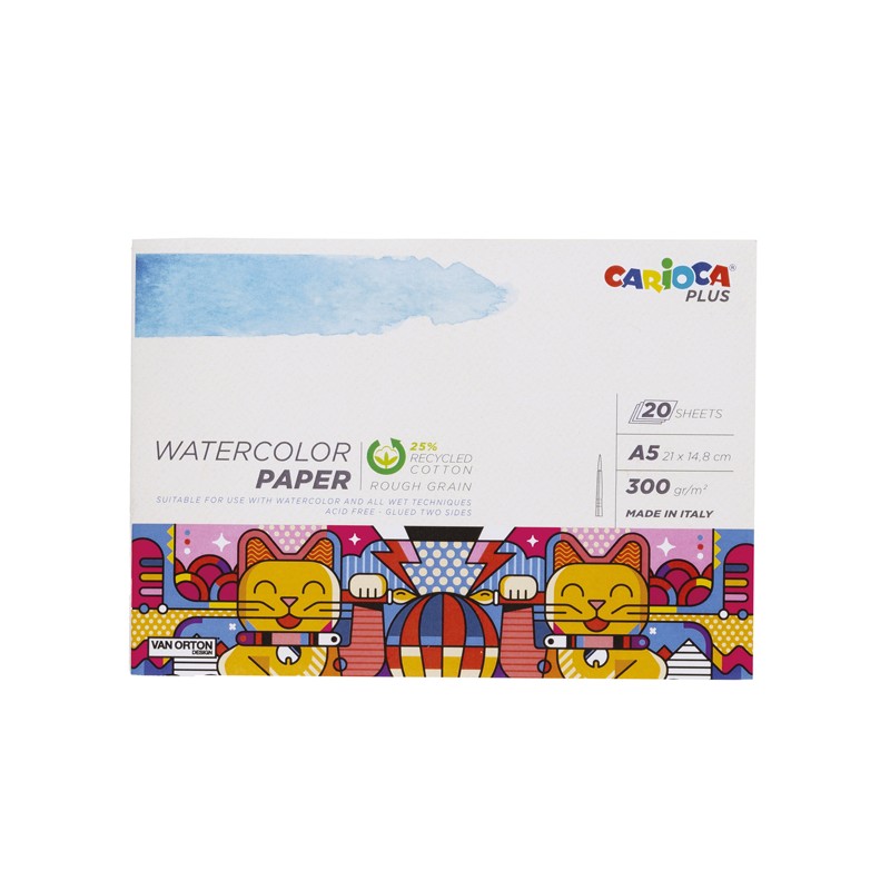 Carta certificata FSC da 300gr/m2 prodotta con il 25% di cotone riciclato perfetta per l'uso con aquerelli e tecniche umide. Grana ruvida. Album da 20 fogli.