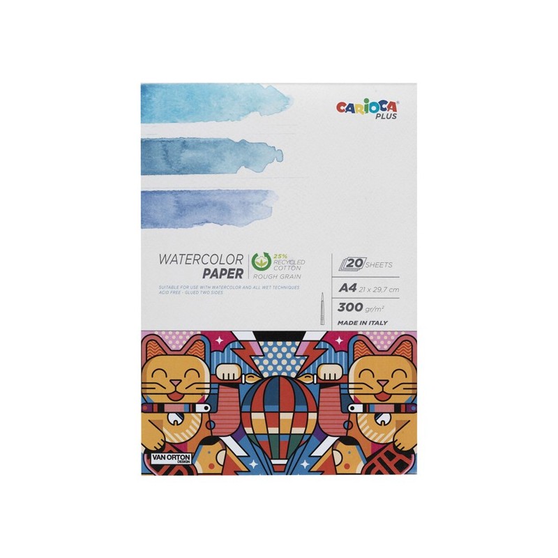 Carta certificata FSC da 300gr/m2 prodotta con il 25% di cotone riciclato perfetta per l'uso con aquerelli e tecniche umide. Grana ruvida. Album da 20 fogli.
