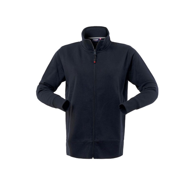 Felpa in cotone (80%) e PL (20%) da donna con chiusura anteriore con cerniera centrale, collo alto, parasudore di colore a contrasto interno al collo, polsi e fascia girovita in maglia elastica, due tasche inferiori a filetto. Su ordinazione tutte le taglie da XS a XXL.